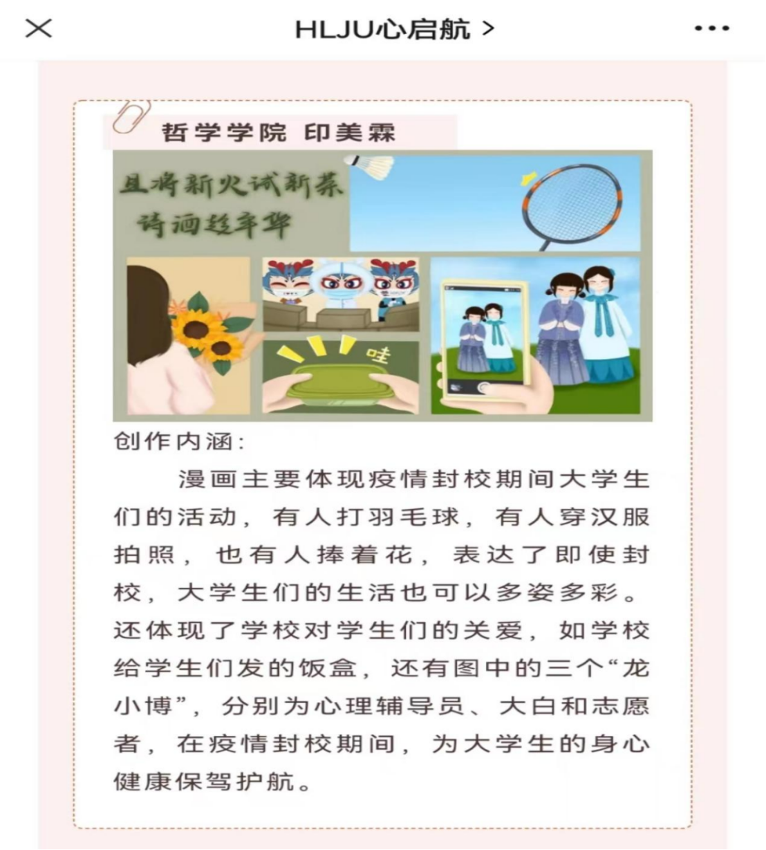 “3.25-5.25”心理活动月举行的疫情下的我们—“黑大春意浓,美景与君同”寻找黑大之美作品征集活动,此次活动从美景、美食、美人三个方面进行作品征集,得到同学们的热情参与,优秀作品在微信公众号上展示。