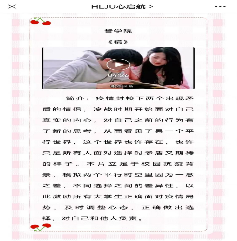影动心声,“疫”路同行。为加强疫情期间心理健康教育知识的宣传和普及,全面提高同学们战胜疫情的信心决心,培养学生疫情期间理性平和、乐观向上的积极心理品质,积极响应校学生工作部心理健康教育中心的号召,征集“万众一心,共战‘疫’情”心理微电影(微视频)作品,同学们用微电影传递青春正能量,展现新时代青年大学生的责任与担当,博彩娱乐城