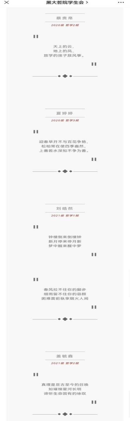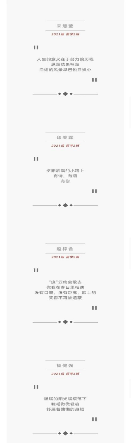 二级心理辅导站于3.25—5.25活动月期间开展心理三行诗作品征集活动,同学们提交的优秀作品被展示在微信公众号上。