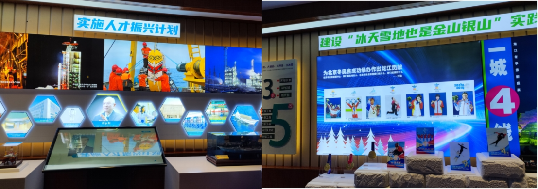 在“总书记黑土情怀”主题教室,以实物展示的形式生动形象讲述了龙江农业发展历程、工业振兴发展历程、冰雪自然资源与奥运健儿的突出贡献,传达了“中国粮仓中国饭碗,推动粮食精深加工,做强绿色食品加工业”、“装备制造业是国之重器,实施人才振兴计划”、“冰天雪地是金山银山”的思想。