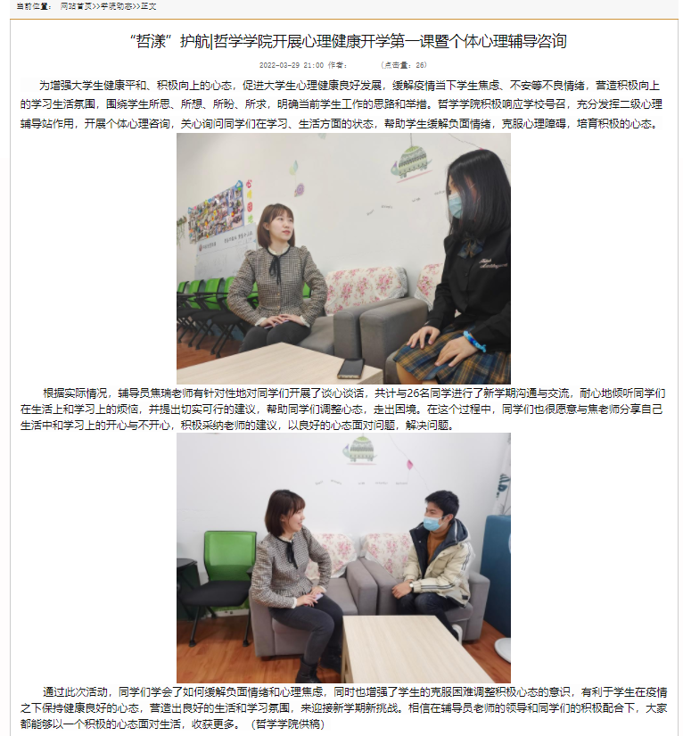 在3月份开展了个体心理咨询,共计30余人次。个体心理咨询帮助了同学们增强了学生的克服困难调整积极心态的意识,有利于学生在疫情之下保持健康良好的心态,营造出良好的生活和学习氛围,来迎接新学期新挑战。