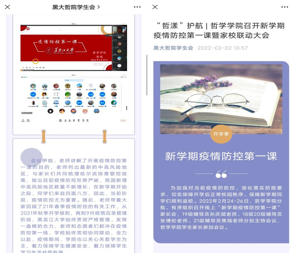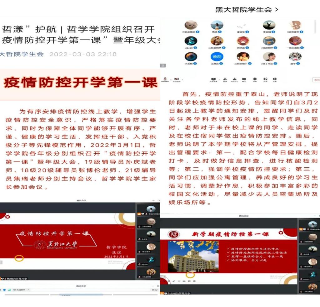 全体辅导员依托“今日校园”家校平台、家长群、腾讯会议等多种形式,于2022年2月24-26日召开新学期家长会。会上传达了学习疫情防控管理的相关规定,为保障学生安全有序返校,采取分层次、分批次返校的方法,建立形成轨迹与疫苗接种台账,实时关注学生行程轨迹与哈尔滨疫情防控管控措施。学校始终贯彻协同联动,全力以赴,疫情期间,博彩娱乐城