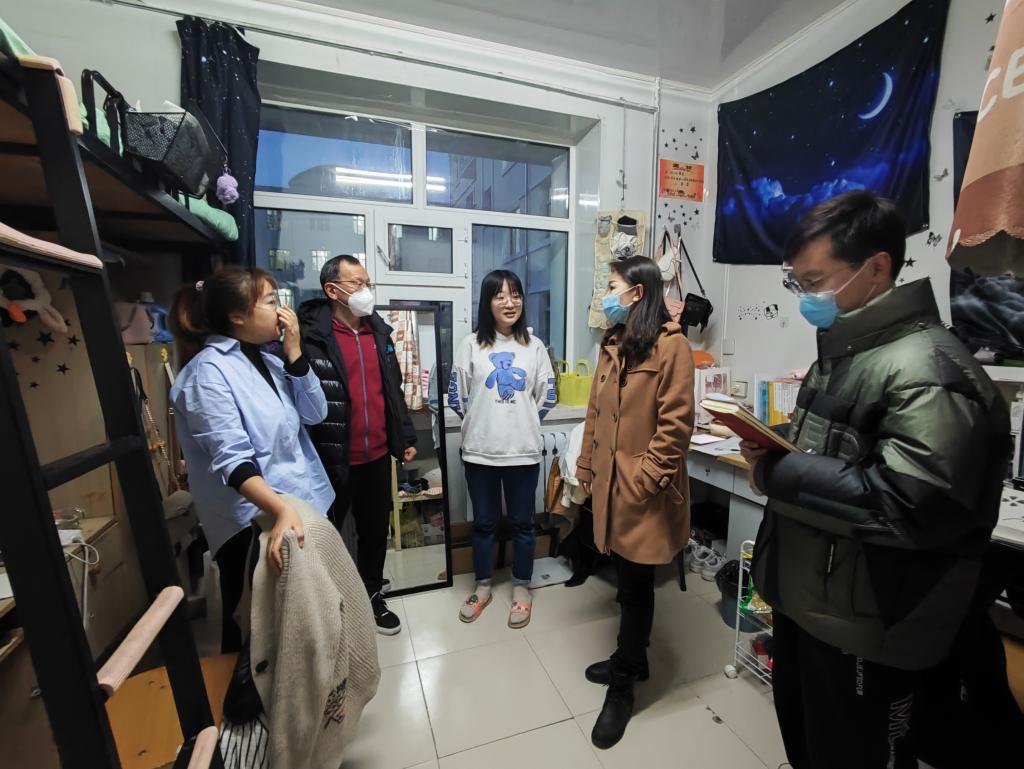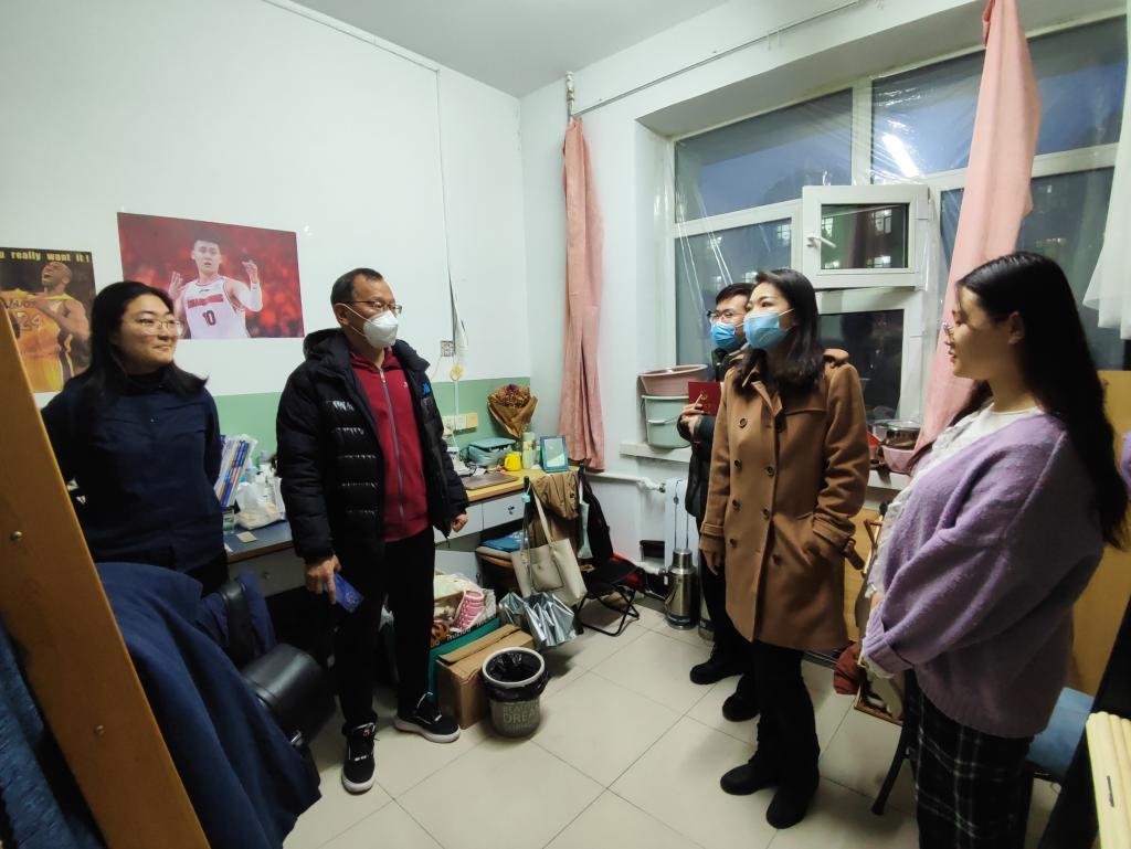 党总副支书记张丽丹、2019级辅导员孙庆斌、2018级、2020级辅导员张博伦和2021级辅导员焦瑞走进各年级学生寝室,为同学们送去疫情管理期间的关心与问候。