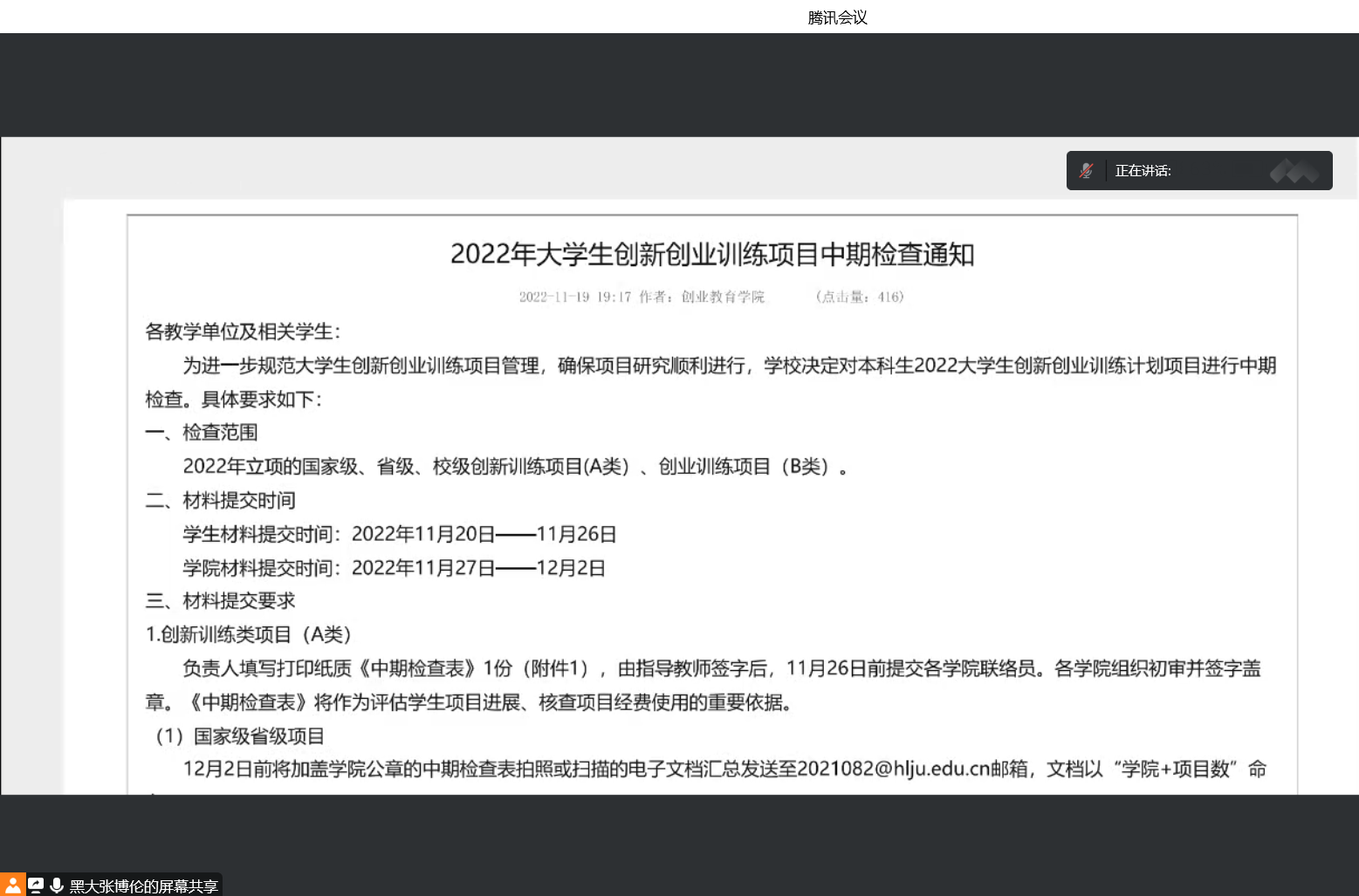 评审会上,张博伦传达了《2022年大学生创新创业训练项目中期检查通知》主要内容,副院长周来顺介绍了进行大学生创新创业训练项目的重要意义、我院既往大学生创新创业训练项目方面取得的成绩以及博彩娱乐城