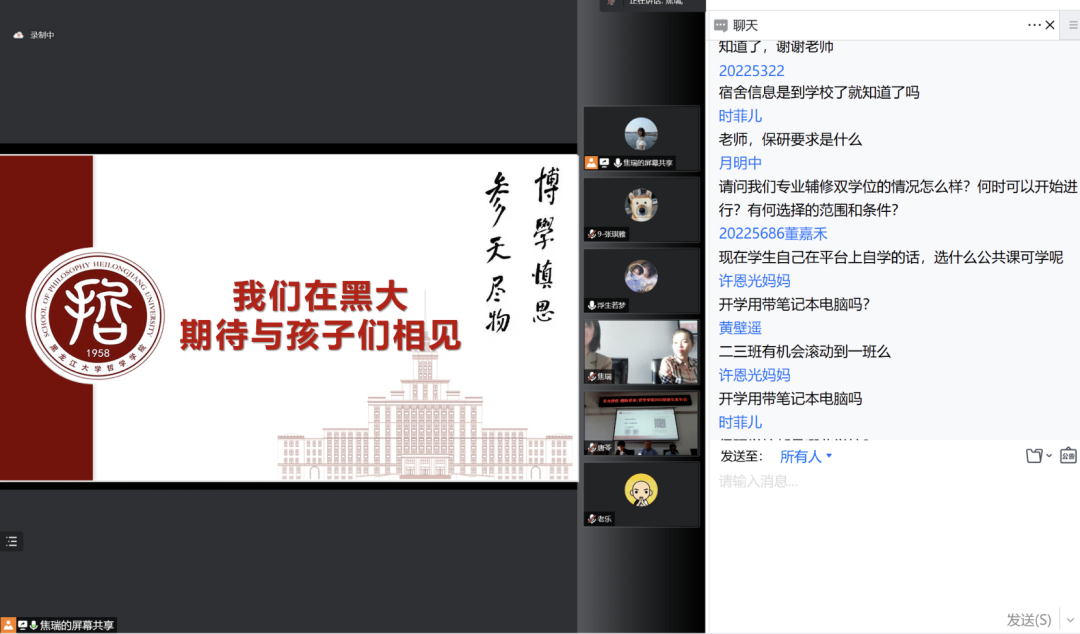 凝心聚力乘风起,奋辑扬帆破浪行。此次线上座谈会切实有效地解决了新生家长的疑问,帮助新生对大学生活做好思想与行动上的准备,为促进师生交流、家校互联打下基础,有效开启了家校协同育人的教育模式。希望2022级新生们,在黑大这片土地上,求科学之真、修人文之善,修学储能,塑造品格,不负青春、不负韶华、不负时代。
